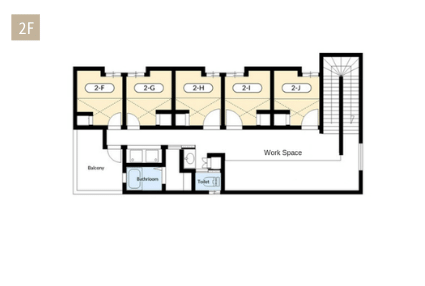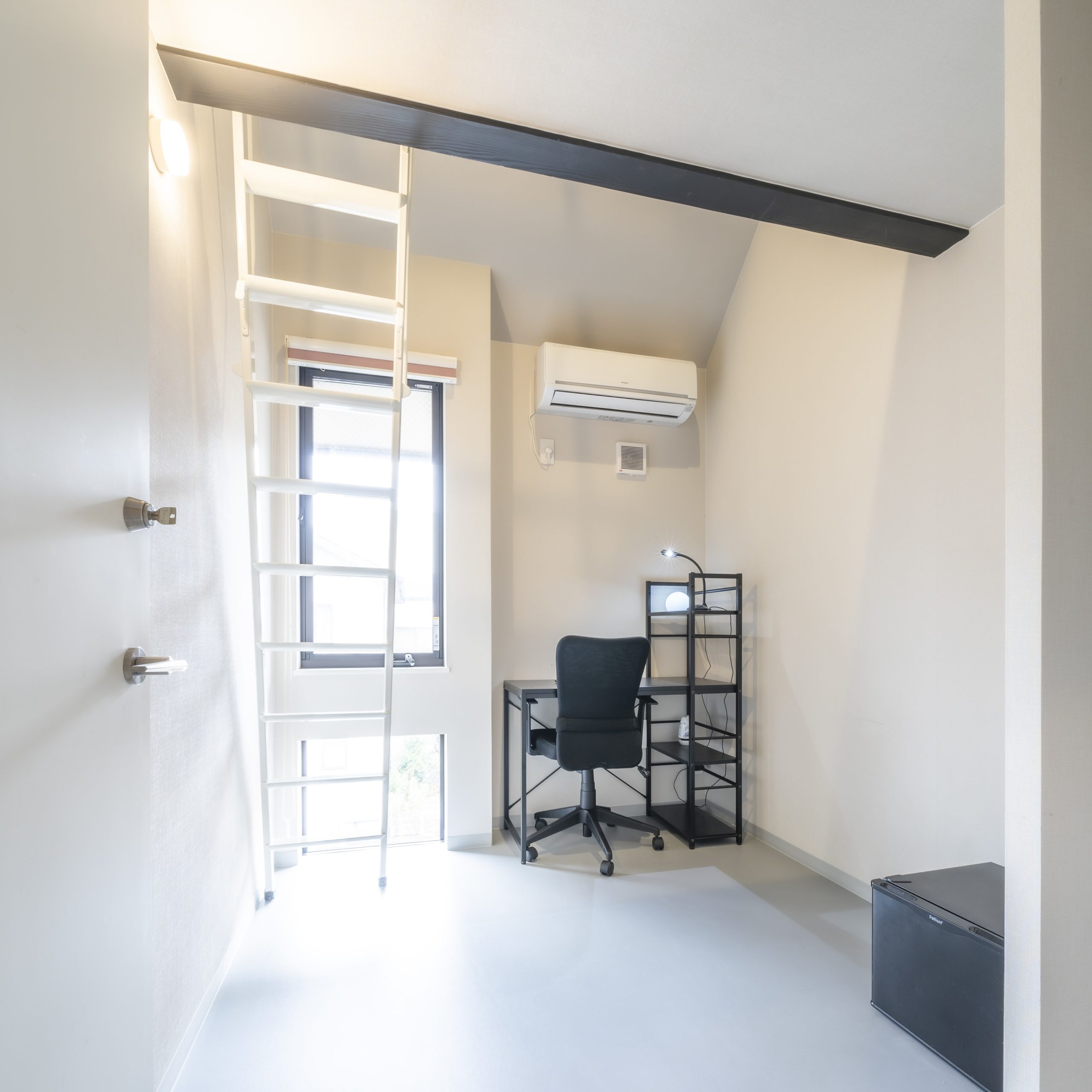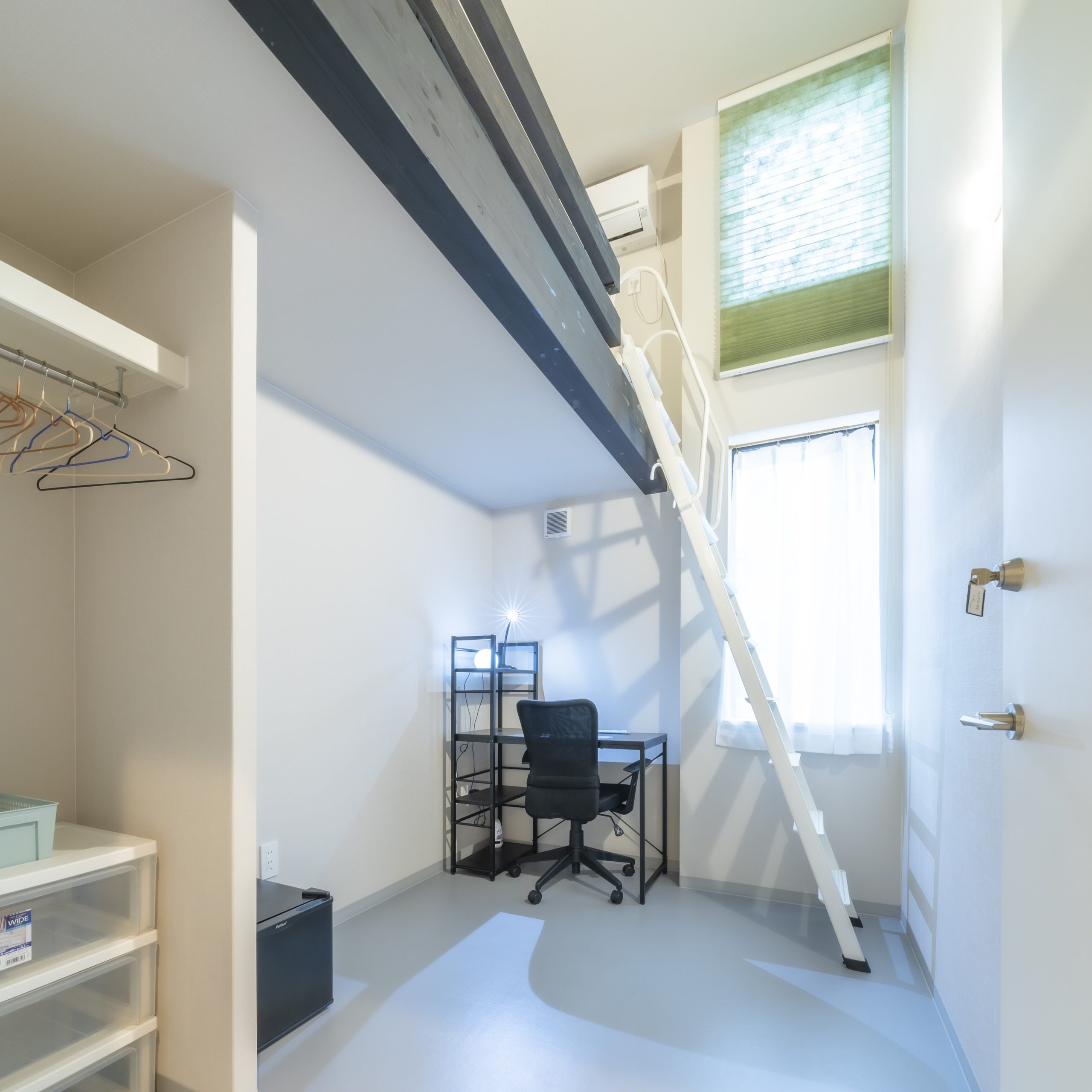 このように個室面積すべてを「個人の居住スペース」として使えるシェアハウスですが、フラットボレロ浄土寺では、さらに間取りを1.5階分の天井高(約4m)、全室ロフト付き(中2階のベッドスペース)としました。寝室と居住スペースを分けることで、お部屋をすっきり使えます。シンプルな生活スタイルの方にはお勧めです。
